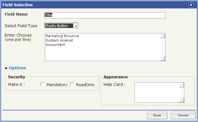 Select "Radio Button" field type from the Drop-Down menu.