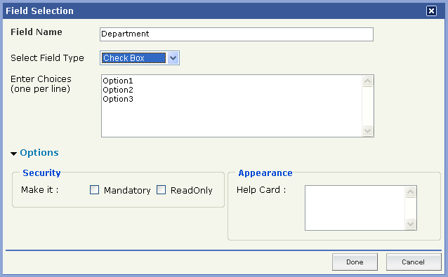 Select "Check Box" field type from the Drop-Down menu.