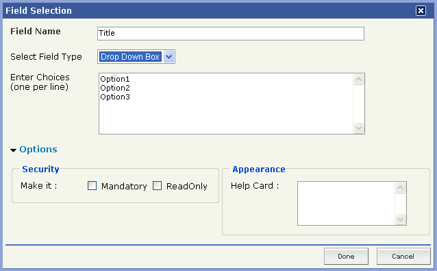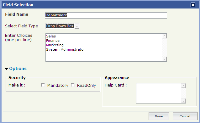 Select "Drop Down Box" field type from the Drop-Down menu.