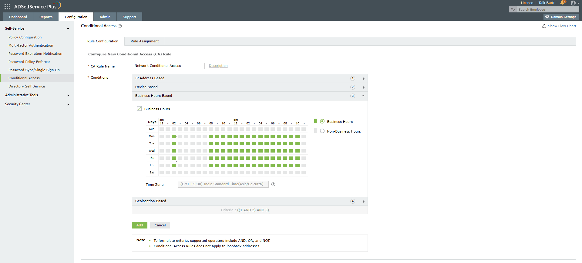 - Select the Conditions based on your requirements:IP Address, Device Type, Business Hours, and Geolocation.