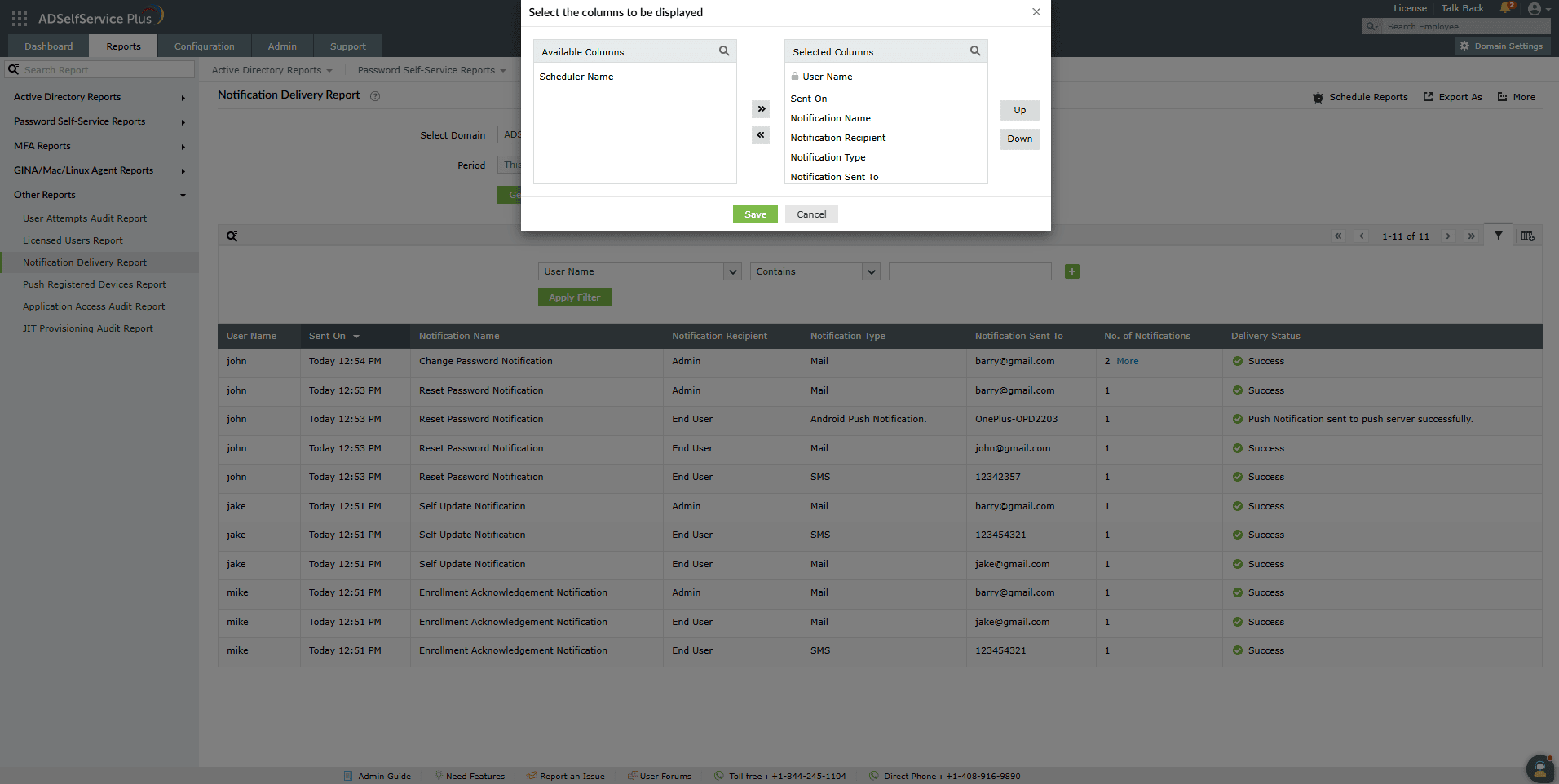 This report provides information on the delivery status of the notifications sent to admins, managers and end users by ADSelfService Plus, including the date, time, name, and type of notification (email, SMS, or push notification).