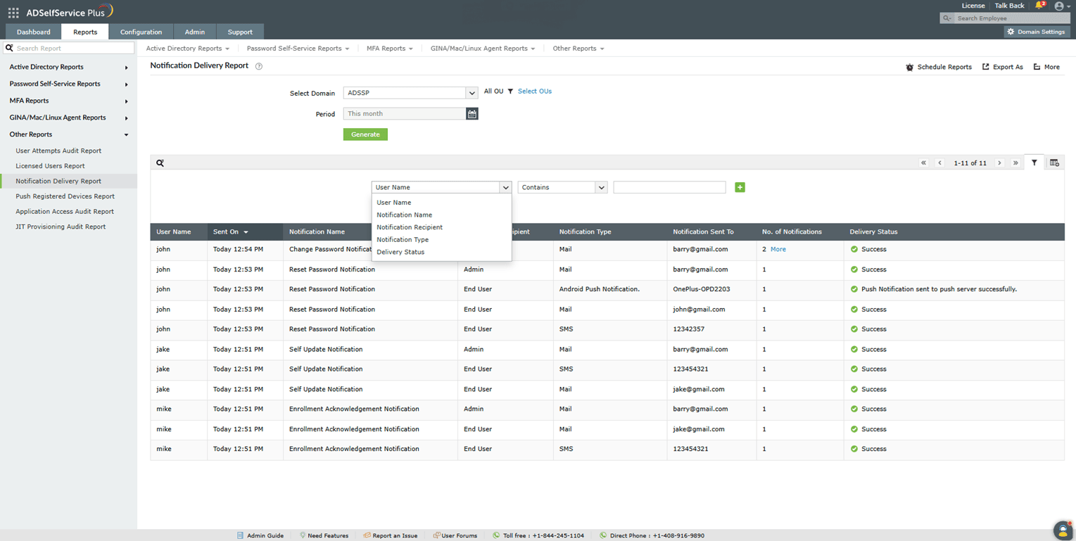 - To generate the Notification Delivery Report, log into the ADSelfService Plus portal with admin or operator credentials and navigate to Reports > Password Self-Service Reports > Notification Delivery Report.